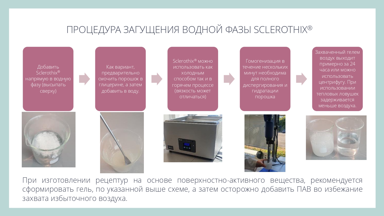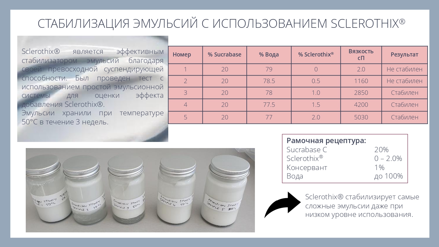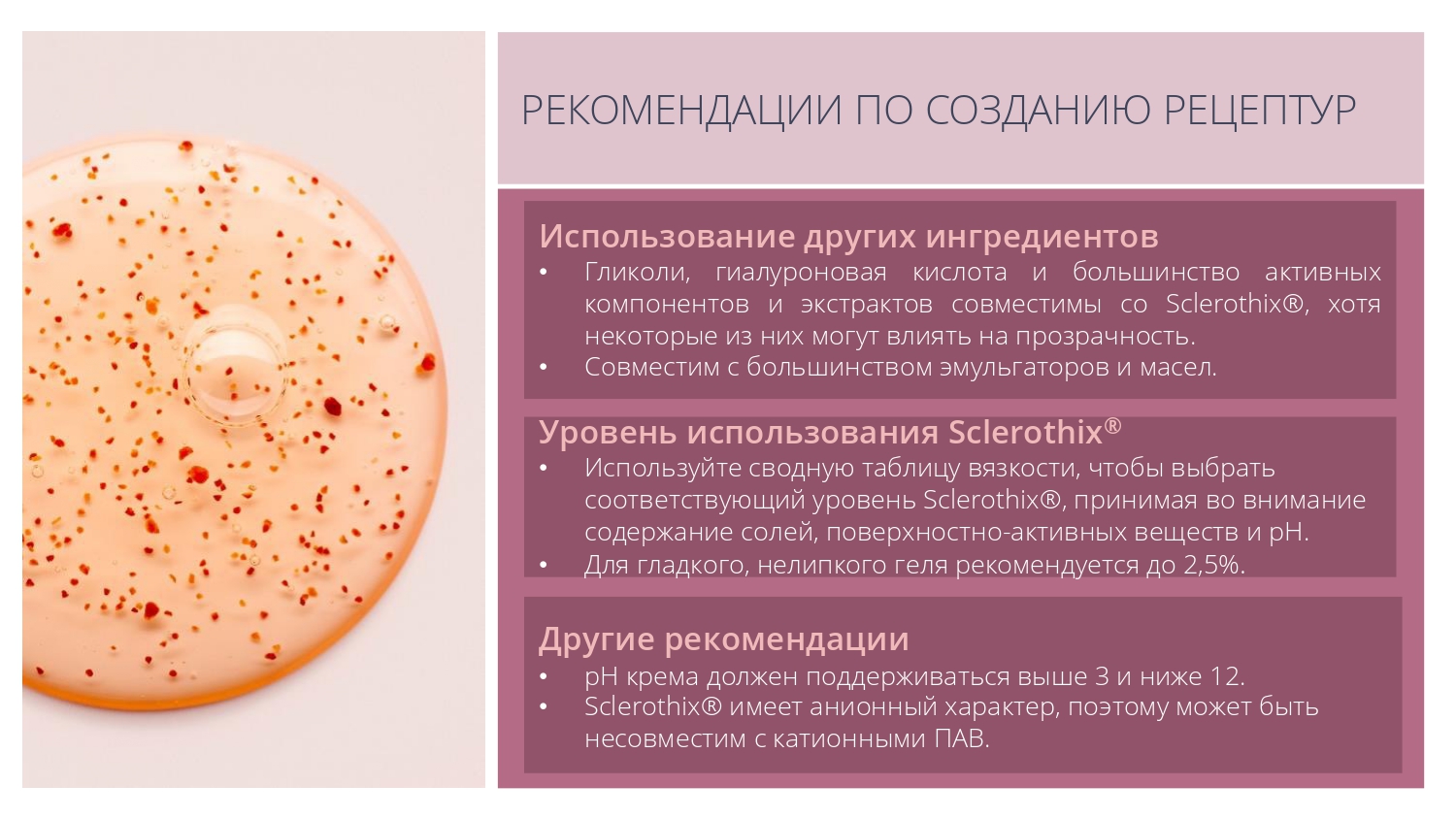 Sclerothix® является эффективной добавкой для улучшения суспендирования (подвешивания) различных частиц - скрабов, глин или пигментов, в том числе в составе моющих систем.